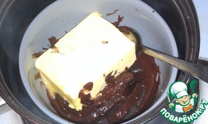 Растапливаем черный шоколад и добавляем в него желатин, предварительно замоченный на 5-7 минут в небольшом количестве воды.