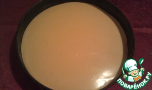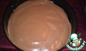 Соединяем 1 часть мусса и шоколад, выливаем на остывший корж. Убираем застывать в холодильник на 1 час, я ставила в морозилку. Да, забыла, стенки формы желательно выстелить пищевой пленкой, чтобы потом можно было легко отделить форму, да и бока будут ровными. Еще можно корж обрезать по краям буквально на пару миллиметров или взять форму чуть больше, чтобы при заливке первого слоя он стек по краям, что позволит закрыть сам корж, впрочем, я этого не стала делать.