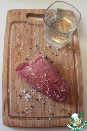 Шаг 1: Нам понадобится кусочек телятины и рассол (500 мл. теплой воды, морская соль и смесь перцев)