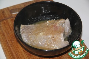Достанем наше мясо из рассола, вытрем его хорошенько и опустим в маринад. -