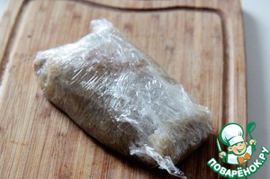 Мясо полностью обмажем маринадом, завернем в пищевую пленку и отправим в холодильник либо еще на 2 часа минимум, лучше на 6-7.