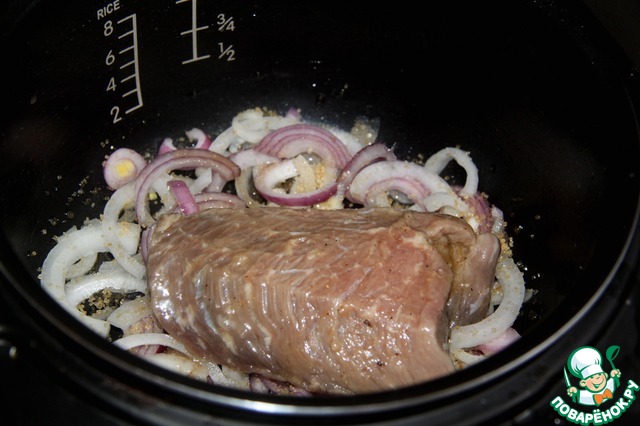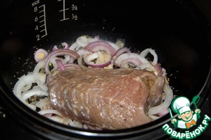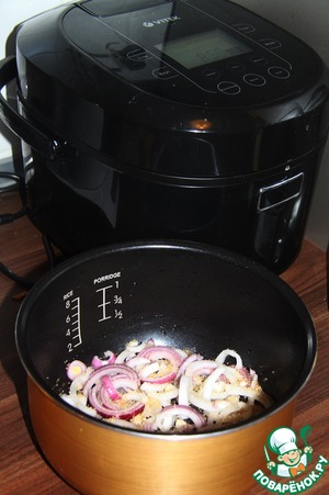 Сверху кладем наше мясо и ставим чашу в мультиварку.