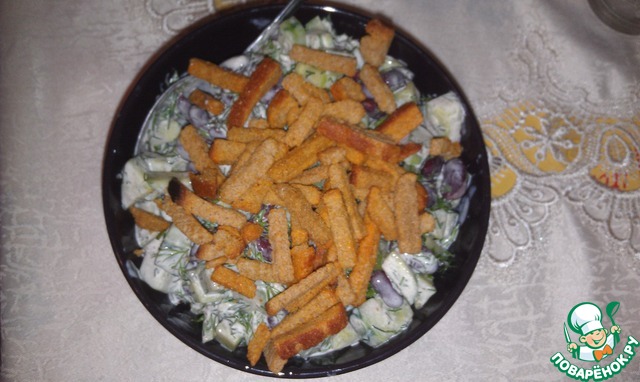 Заправить майонезом, если необходимо, можно подсолить. Непосредственно перед подачей добавить сухарики. Можно их отдельно подать, чтобы каждый сам по вкусу добавлял себе в тарелку.