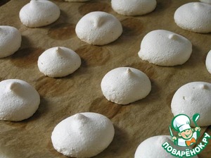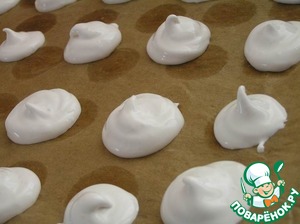 С помощью чайной ложки выложить белки на бумагу для выпечки, формируя небольшие "шапочки" (или с помощью кулинарного мешка).