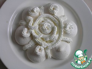 Покрыть сливками. Выложить второй слой безе и сливки. Повторить еще 1-2 раза (в зависимости от диаметра Вашего торта), пока не кончатся ингредиенты (пару безе оставить для украшения)