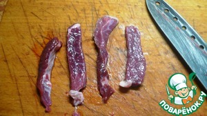 Мясо помыть, обсушить и нарезать на длинные полоски (можно произвольно)
