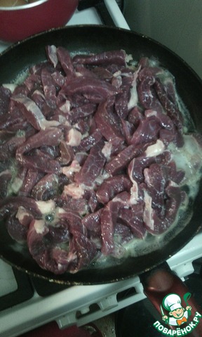 В оригинальном рецепте мясо надо слегка обжарить, накрыть крышкой и тушить на минимальном огне почти до готовности, по мере надобности добавляя воды. Я не обжаривала, так как у моей мамы больная поджелудочная железа и ей жареное нельзя. Я нарезанное мясо вымыла и, сильно воду не сливая, выложила мясо на раскаленную сковородку, прикрутила огонь на минимум и 2 часа тушила мясо под крышкой, периодически помешивая. Когда мясо стало мягким, солим его.