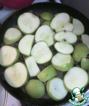 Сверху выкладываете "крышку" яблоками и накрываете крышкой (следите, чтобы в мясе еще оставалась жидкость, а то пристанет к сковородке). Тушите так еще 10-15 мин., яблоки пожелтеют.