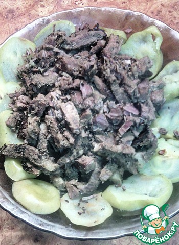 Рецепт очень старый, найденный мамой в журнале "Колхозница" или "Работница", она и сама уже не помнит :) Мясо получается мягкое, нежное, с тонкой ноткой чайного аромата и легким, почти неощутимым вкусом яблока.