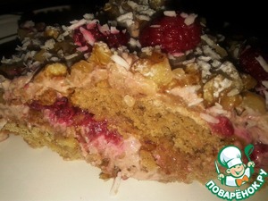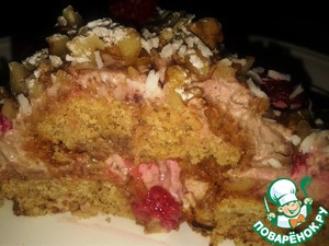 Укрываем первый слой печенья шубкой из крема, измельчённых орехов и ягод;