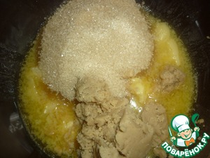 Приготовим тесто. Смешиваем тростниковый сахар, арахисовое масло (рецепт нашла на сайте) и сливочное масло. Смешиваем миксером.