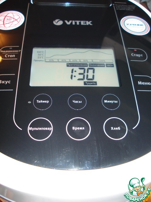 Включаем режим "Тушить" 1,5 часа. Если у вас молодой кролик и небольшие кусочки, то вам должно хватить на тушение 1 часа.