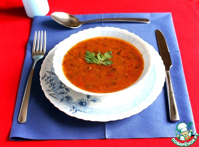 [+5]Прочитав комментарии, количество томатной пасты и перца уменьшила в два раза и добавила немного сахара. Вместо лука-порея положила стебель сельдерея. Невероятно вкусное и ароматное блюдо. Спасибо за рецепт!