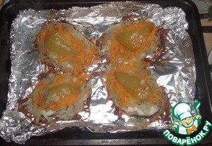 Укладываем наши ингредиенты слоями на противень, застеленный фольгой: