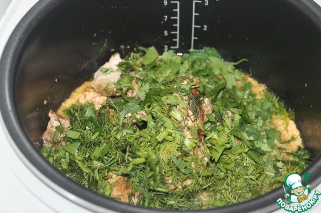 • За 30 минут до окончания программы открыла крышку, добавила рубленую зелень укропа и петрушки и белые грибы и продолжила тушение