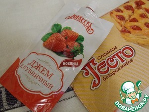 Тесто раскатать в одном направление. Разрезать на 5 одинаковых частей. Четыре из них намазать джемом "Махеев". Видите на фото плотные кусочки? Это клубника.