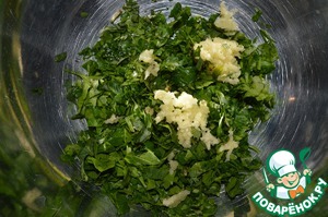 Сперва отложим все и возьмемся за петрушку и мяту. У петрушки сразу срежьте "ножки", они не нужны. Чем мельче нарубим, тем лучше, а затем закидываем в миску. Туда же выдавим чеснок. (Аромат изумительный)
