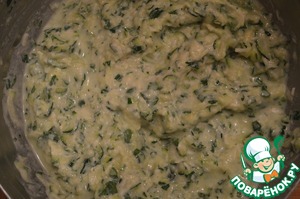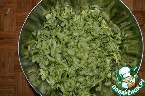 Приступаем к цуккини, ничего особенного, просто натираем на крупной терке, закидываем в дуршлаг и отжимаем хорошенько всю воду. Перемещаем в миску к зелени. Терку не убираем, понадобится еще. Не забудьте сполоснуть ее ;)