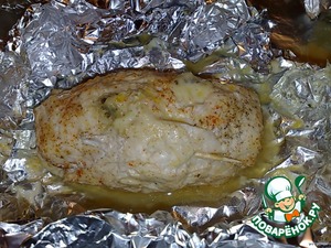 3. На фольгу кладем филе, сверху начинку, порезанный пластинками чесночок (1 /2 шт). Сверху четветую часть сыра.