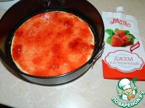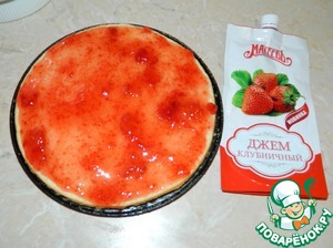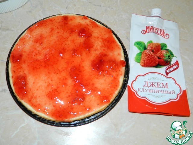 Готовый корж остужаем, отделяем от формы и оставляем в ней. Смазываем джемом "Махеев" клубничный.
