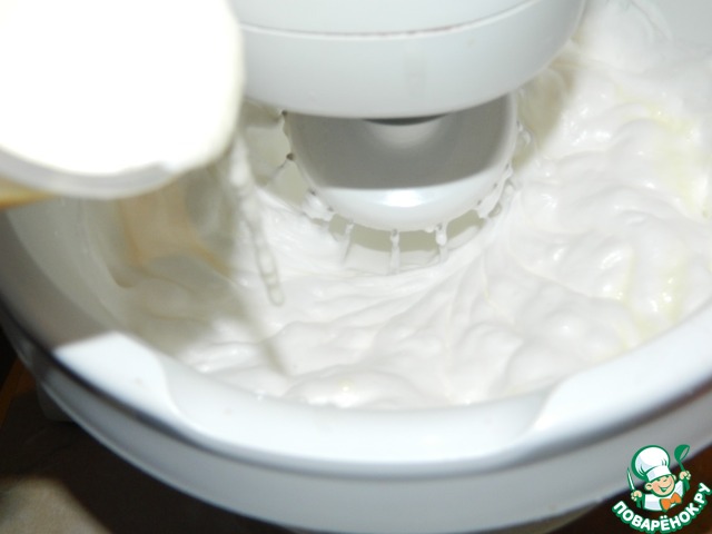 В хорошо взбитые белки начинаем вводить по чуть-чуть сахарный сироп, не прекращая взбивать.