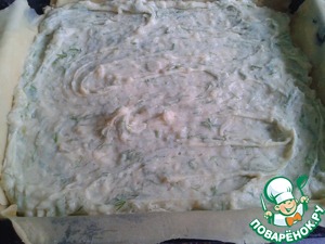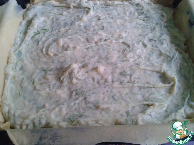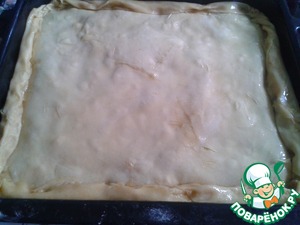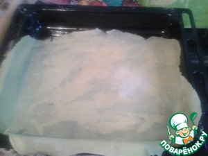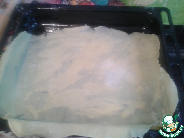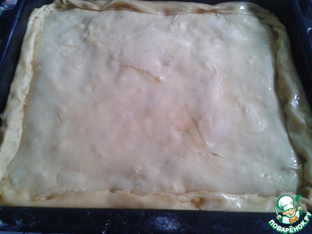 Уложить, прикрывая бортики, обильно смазать оливковым маслом. То же проделать с 2 другими частями. В результате бортики противня должны быть закрыты.
