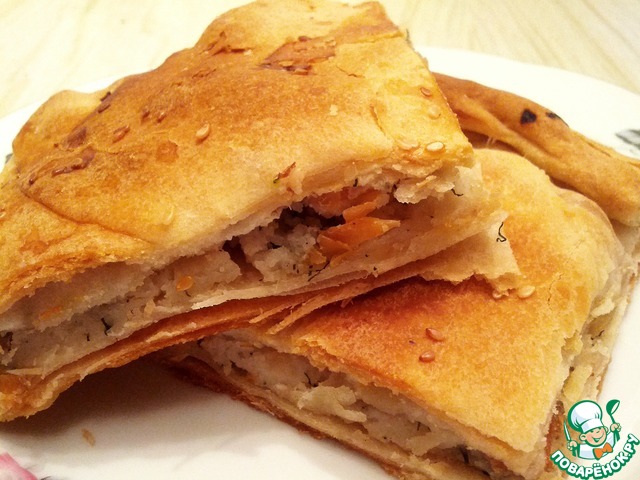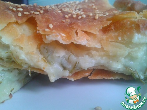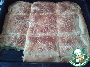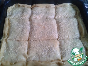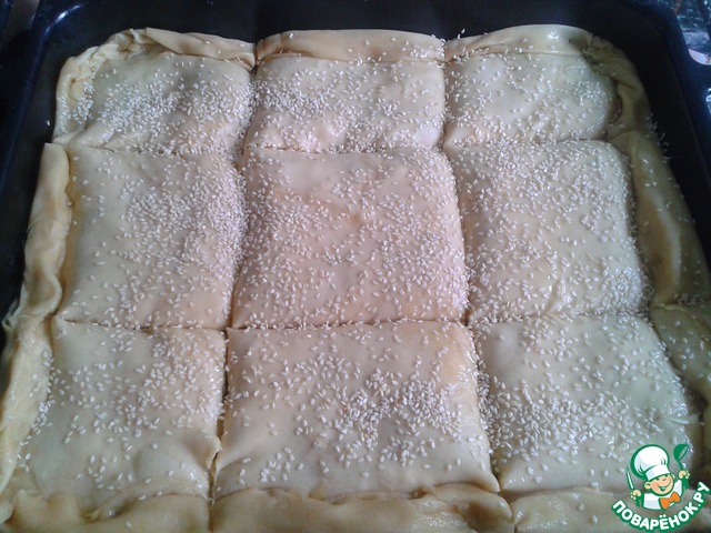 Ножом разрезать верхние слои на порционные куски, обильно смазать оливковым маслом, сбрызнуть молоком, посыпать кунжутом.