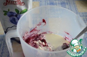 В творожную массу добавить черничный джем, остывшее молоко с желатином и все хорошо взбить.