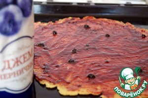 Тонко раскатываем большую часть теста. Перекладываем на противень, смазываем джемом.