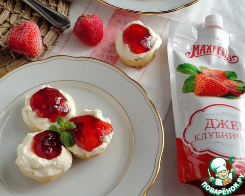 Взбить сливки. На каждую булочку кладём по 1 ч. л сливок, сверху клубничный джем от ТМ "Махеев". Этот джем густой, ароматный и очень вкусный.
