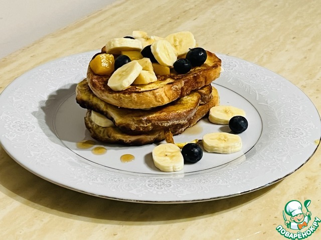 Яйца взбить с молоком. Хлеб обмакивать в смесь и обжарить на оливковом масле с двух сторон до золотистой корочки.