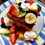 Затем тарелку украсить полосками, капельками любого варенья и сделайте пирамиду из гренок и фруктов. Выходит три слоя гренок и два слоя фруктов.