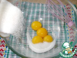 Разделить яйца на желтки и белки, белки пока отставить в сторону. В желтки высыпать 0,75 стакана сахара, растереть добела.
