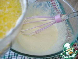 Масло сливочное растопить, смешать с молоком и сметаной, вылить в сахарно-желтковую массу, размешать.