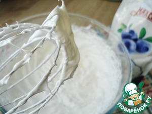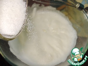 А пока займемся облаками. Для безе взбейте в пышную пену белки и, постепенно подсыпая сахар, продолжайте взбивать до жестких пиков.