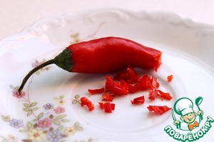 Перец чили помыть, обсушить и очень мелко порезать (тут советую руководствоваться личными предпочтениями). ВНИМАНИЕ: лучше использовать перчатки и стеклянную разделочную доску, т. к. при нарезании вы не отмоете перец ни с рук, ни с доски. Если не использовались перчатки, то нужно быть очень аккуратными, ни в коем случае не тереть глаза!