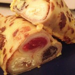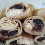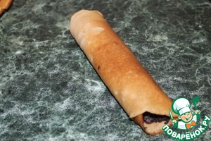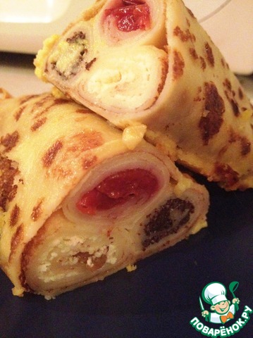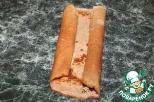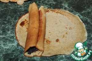 Выкладываем на блинчик с противоположных сторон маковую и творожную начинку.