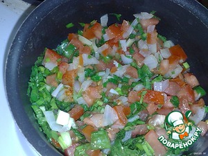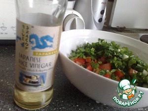 1. Нарезать лук, помидоры. Разогреть масло и выложить туда сначала лук, перемешать. Через 3 -4 мин добавить помидоры, посолить, добавить зелень порезанную, перец. Все хорошо перемешать и проварить еще 1 -2 мин. , потом Слить 1 стол. ложку рисового уксуса.