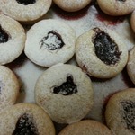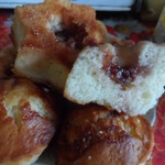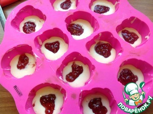 В форму выложить немного теста, сверху малиновый джем Махеев по чайной ложке