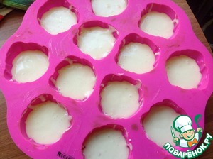 Залить тестом, но чтобы формы были заполнены на треть. Тесто на кефире поднимается очень сильно. Отправить в духовку на 25-30 мин при 180 гр