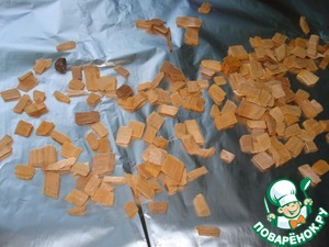 Складываем фольгу в несколько слоев. Высыпаем на нее ольховую стружку.