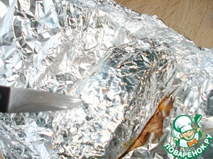 Достаем мясо, не разворачивая, делаем проколы в фольге ножом.