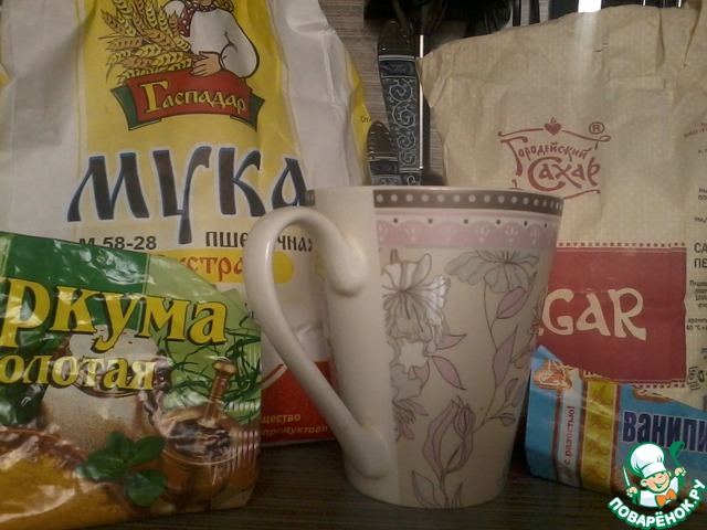 Это наши ингредиенты! Как вы поняли, блинчики будут абсолютно постными, будем готовить их без молока и яиц (когда изобретался рецепт, яйца были на вес золота!) И еще очень важно! В этом рецепте нам понадобится именно разрыхлитель теста, а не сода, и обязательно добавим куркумы, тогда блинчики будут необычайно солнечными и румяными!