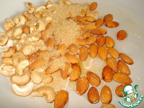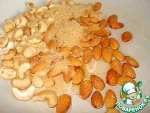 А пока займемся орехами. У меня был миндаль и кешью. На сковородку высыпьте орехи, добавьте 1 столовую ложку воды и 2 чайные ложки сахара. Поставьте сковороду на огонь и, помешивая, карамелизуйте орехи.