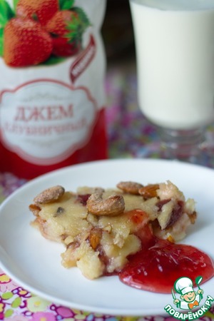 Жаропрочную форму, в которой вы делали пенки, смажьте сливочным маслом и выложите 1/3 часть каши. Сверху половину клубничного джема.