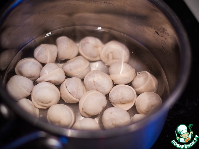 Налейте в кастрюльку водички, буквально столько, чтобы она еле-еле покрывала все пельмешки. Посолите, добавьте лаврушку. Доведите до кипения, тут же слейте воду и отложите пельмени.
