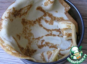 У меня не было разъемной формы диаметром 11 см, поэтому просто взяла невысокую мисочку нужного размера, но она оказалась низковатой, что не помешало выложить крем "горкой". Когда стала укладывать три блинчика-рулета, то с трудом запихала третий. После положенного времени ожидания торт легко извлекся из формы (подцепила силиконовой лопаткой), при доставании не развалился, сохранил форму (и сохранял форму до последних минут своей жизни).