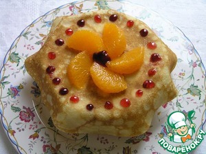 Накрыть оставшимся блинчиком, украсить капельками малинового и черничного джемов. В центр выложить очищенные дольки клементина.