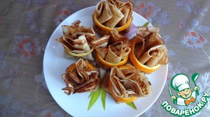 Берем края нашего блинчика, поднимаем, соединяем и просовываем через него наше апельсиновое кольцо. Таким же образом делаем с остальными блинчиками. Выкладываем на блюдо и подаем!