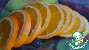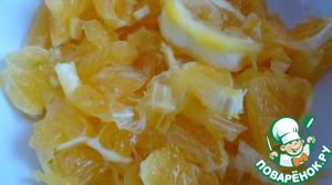 Режем апельсины кольцами и аккуратно отделяем цедру от мякоти, чтобы у нас колечко осталось неповрежденное. Оно нам еще пригодится. Режем мякоть апельсина на небольшие кусочки,